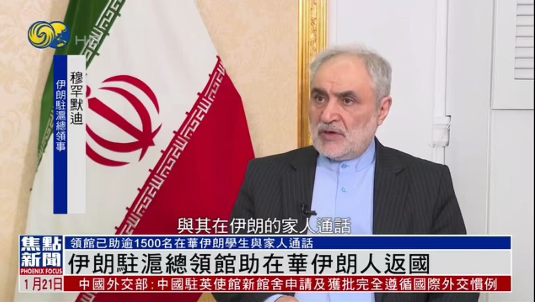 مصاحبه شبکه ماهواره ای فونیکس چین با سرکنسول جمهوری اسلامی ایران در شانگهای در خصوص اتفاقات اخیر کشور و چگونگی حمایت سرکنسولگری از ایرانیان در شرایط مذکور